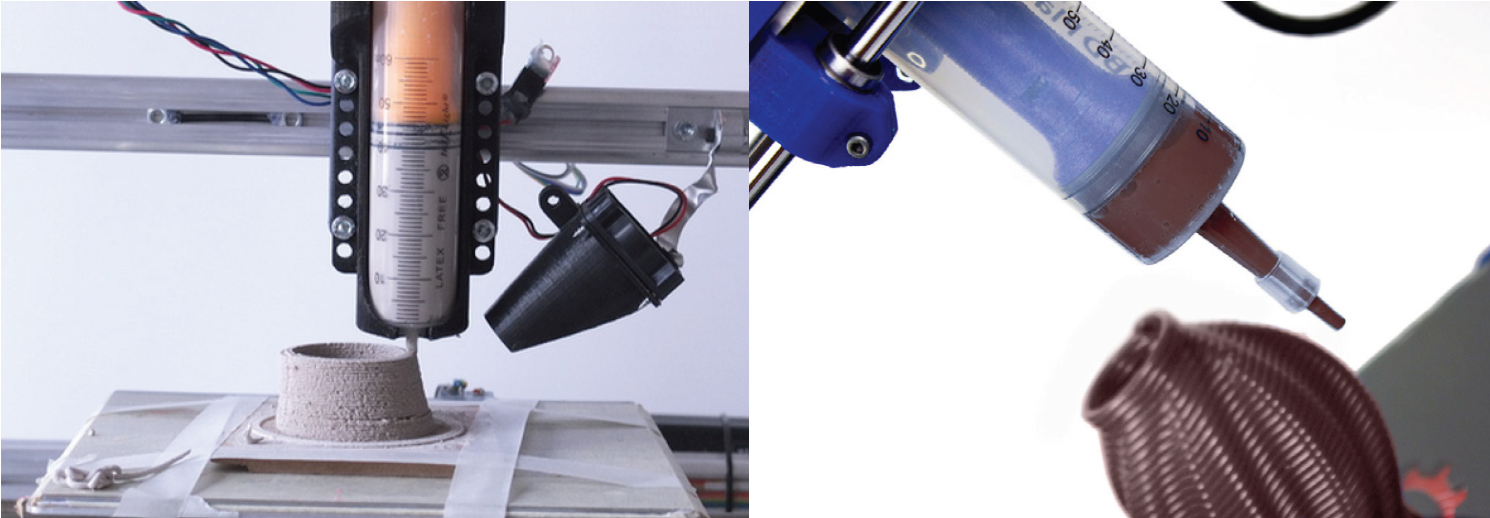 쭈욱 짜낼 수 있는 소재들을 이용한 방식입니다. 짜낼 수 있는 소재에는 점토, 초콜릿, 쿠키반죽, 시멘트 등이 있습니다. 이러한 ‘반죽(Paste)’ 유형의 소재를 압출하는 것을 ‘Paste Extrusion’ 이라고 합니다.