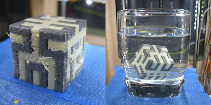 서포트용 재료는 PVA같은 물에 녹는 재료를 사용하여, 출력후에 물이나 전용액에 넣어두어서 서포트를 녹입니다. 이 방법으로 눈에 보이지 않는 서포트도 제거가 가능합니다.