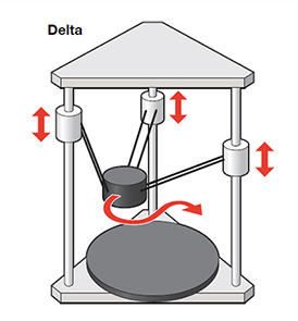 최근 자주 출시되고 있는 삼각형 기둥모양의 프린터가 델타 방식입니다. 델타방식 3D프린터의 특징은 압출기부분이 X, Y, Z축의 운동을 하고, 베드부분은 고정되어 있는 점입니다. 그래서 한 축으로 모든 3D 프린팅을 하기 때문에, FDM방식 중에서는 제일 빠르며, 베드가 고정되어 있어서 출력물 또한 안정적으로 출력이 가능합니다. 델타 방식의 단점은 크기에 비해 출력 사이즈가 작다는 단점이 있습니다.