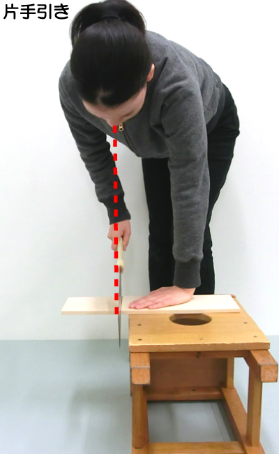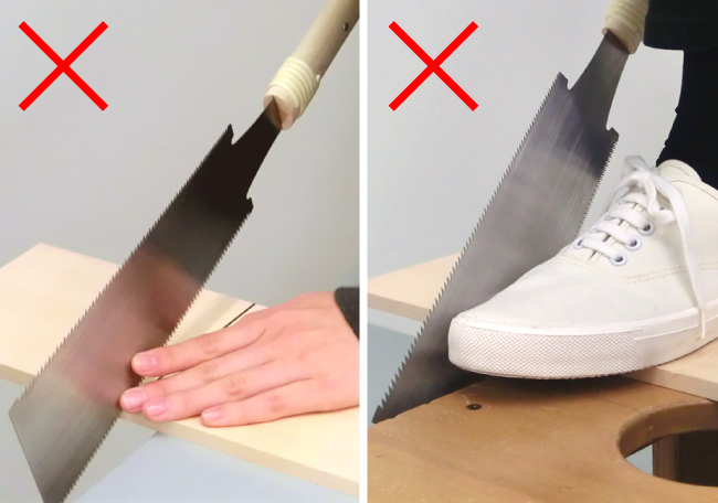 | 한손 끌기는 오른손과 반대편 손으로 재료를 잡고 자르는 방식으로, 재료가 움직이기 쉬워 얇은 봉재 등을 자르는 데 적합하다. | 양손잡이는 발로 재료를 잡고 양손으로 톱을 잡아당기는 방식이다.안정성이 뛰어나 대형 목재나 두꺼운 목재 절단에 적합하다.또한, 세로로 자르는 경우 목재의 흔들림이 커지기 쉬우므로 양손잡이를 사용하는 것이 좋습니다. |