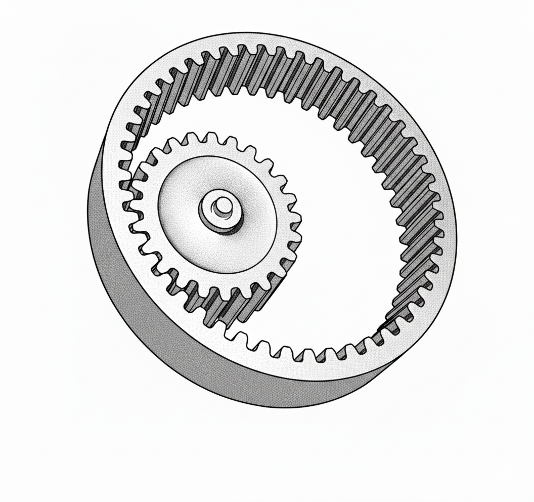 - 원리와 특징: 바깥쪽의 작은 기어(피니언)가 내부 기어의 안쪽에서 맞물려 회전합니다. 일반적인 외접 기어와 달리, 두 기어가 같은 방향으로 회전하는 것이 가장 큰 특징입니다. 이 덕분에 전체적인 장치를 매우 콤팩트하게 설계할 수 있습니다.