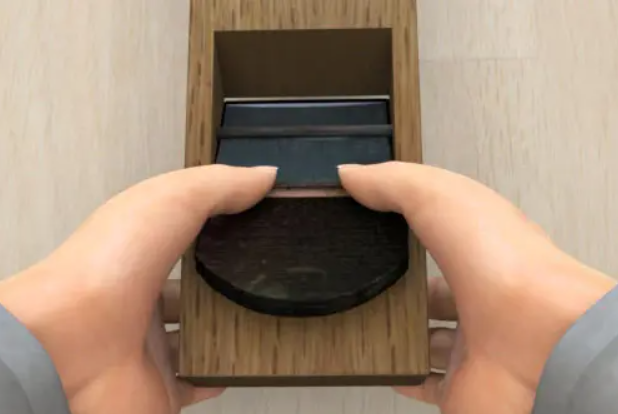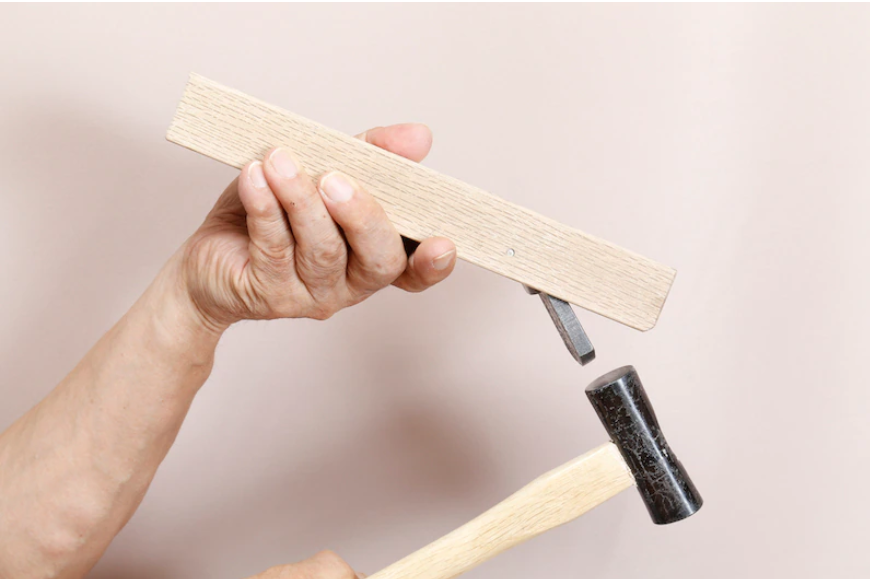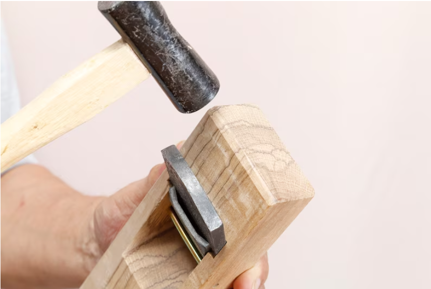 망치로 대팻날 머리를 두드려 칼날을 꺼냅니다. 칼집을 거꾸로 잡고 바닥을 따라 눈을 들여다보면 칼날이 얼마나 튀어나왔는지 쉽게 확인할 수 있습니다. 바닥에서 가느다란 선이 한 줄로 보일 정도로 조정한다. |