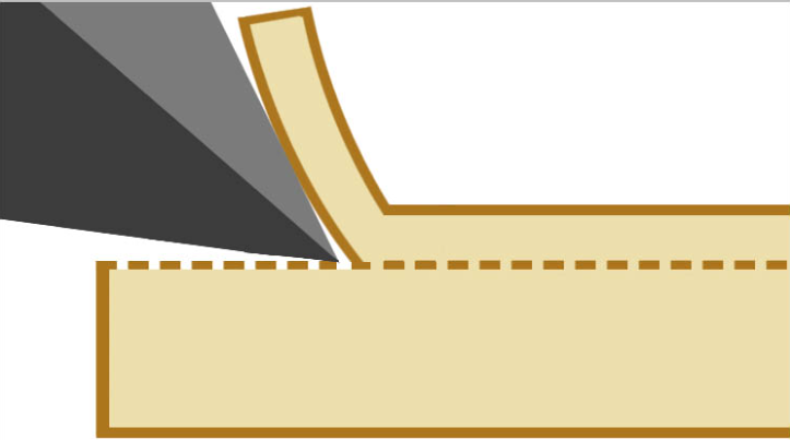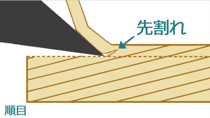엇결의 목재를 깍을때 나뭇결이 아래쪽을 향하고 있기 때문에 깎은 면보다 아래쪽으로 선균열이 진행되고 있음을 알 수 있습니다. 또한, 칼날이 선단 균열을 파고들면, 대패밥은 선단 균열의 가장 깊은 뿌리에서 접히게 됩니다. 이것이 연속적으로 반복되면 깎인 면은 울퉁불퉁해집니다. |
