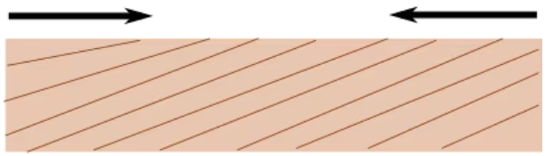 순결의 목재를 깍을때 그림처럼 목재의 선균열이 발생하고 깎은 면보다 위쪽이 먼저 갈라집니다. 왜냐하면 나뭇결의 방향이 위쪽을 향하고 있기 때문입니다. 순결 방향은 선균열이 발생 되어도 그 부분은 대팻날로 깎아내기 때문에 표면은 깨끗하게 마무리됩니다. |
