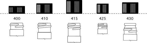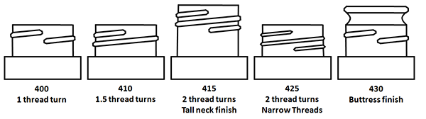 오른쪽에 표시된 뚜껑과 병목의 예로 돌아가서 실이 병 주위를 한 바퀴 반 돌고 있는 것을 볼 수 있습니다. 이를 아래의 일반적인 스레드 스타일 이미지와 비교하면 스레드 스타일이 410임을 알 수 있습니다. 따라서 이 예제의 두 번째 숫자는 410입니다. 이제 예제의 캡 크기와 목 마감을 모두 결정하는 데 필요한 모든 것이 준비되었습니다. 직경은 28mm이고 스레드 스타일은 410이므로 이 예제의 캡 크기와 넥 마감은 28-410입니다.