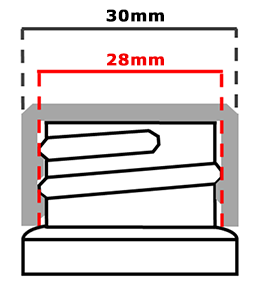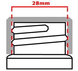 캡 크기와 넥 마감은 두 개의 숫자로 표시됩니다. 첫 번째 숫자는 지름을 나타냅니다. 캡의 경우 이 숫자는 캡의 내부 직경을 나타냅니다. 넥 마감의 경우 이 숫자는 병 목에 있는 실의 외경을 나타냅니다. 오른쪽 예시에서 볼 수 있듯이 빨간색 점선은 뚜껑의 내경과 병 목에 있는 실의 외경을 나타냅니다. 이 예에서는 두 가지 모두 28입니다.