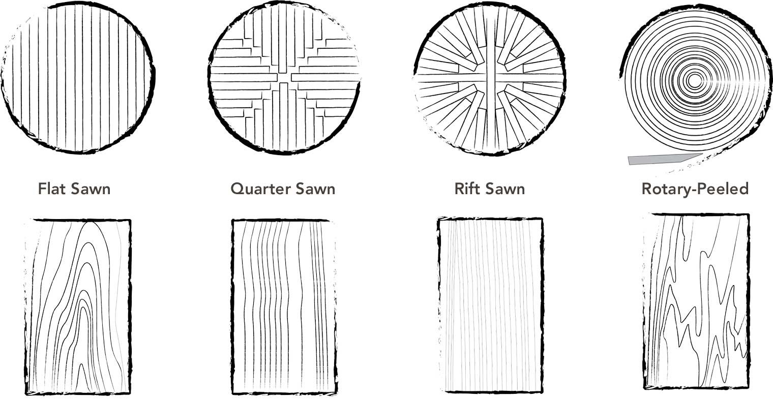 통나무를 가공하여 판재를 제재할 때, 어떤 방식으로 제재하느냐에 따라 나뭇결의 모양이 달라집니다.