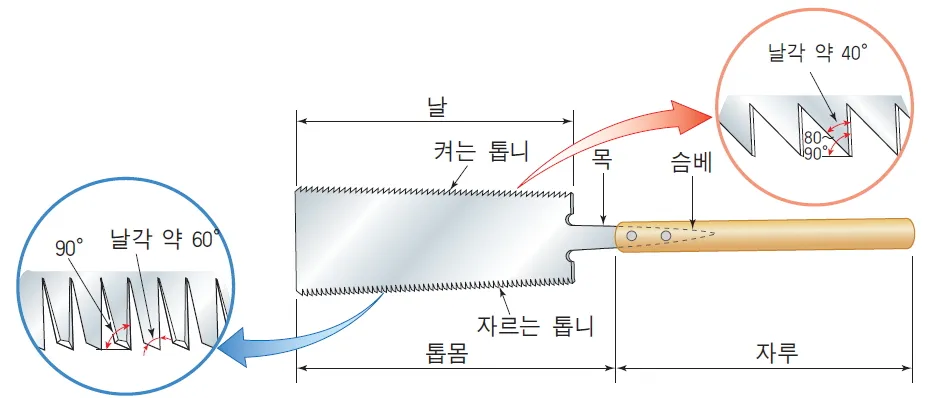 톱은 나무를 자르는 데 없어서는 안 될 도구입니다.전동 절삭 공구와 달리 충전이나 전원 확보의 번거로움 없이 바로 사용할 수 있고, 가볍고 작은 크기로 수작업 특유의 섬세한 작업을 할 수 있는 등 많은 매력을 가지고 있습니다.그런 톱의 사용법을 소개합니다. 1. 톱의 부위와 명칭 2. 톱의 종류 양날톱톱날의 양쪽에 각각 가로날과 세로날이 달린 톱입니다.효율적으로 직선 절단이 가능합니다.등대기톱 톱질할 때 톱날이 흔들리는 것을 방지하기 위해 날 윗부분에 곧은 철 대(등대기)가 있는 톱으로톱날이 얇고, 켜기와 자르기 모두 가능한 장점이 있고, 세밀한 작업이 가능해 가구제작에 주로 사용합니다.단, 등대기로로 인해 깊이가 깊은 절단 작업에는 불편함이 있습니다.실톱톱니가 가늘고 얇은 줄같이 된 톱으로, 이를..